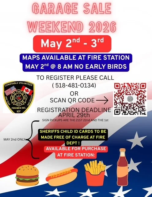 Constable Garage Sale Weekend May 2nd - 3rd . CVFD One Team, One Mission . Now accepting online donations click the donations button below . .